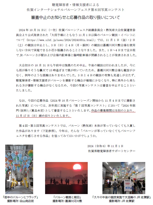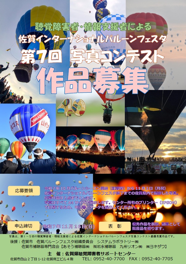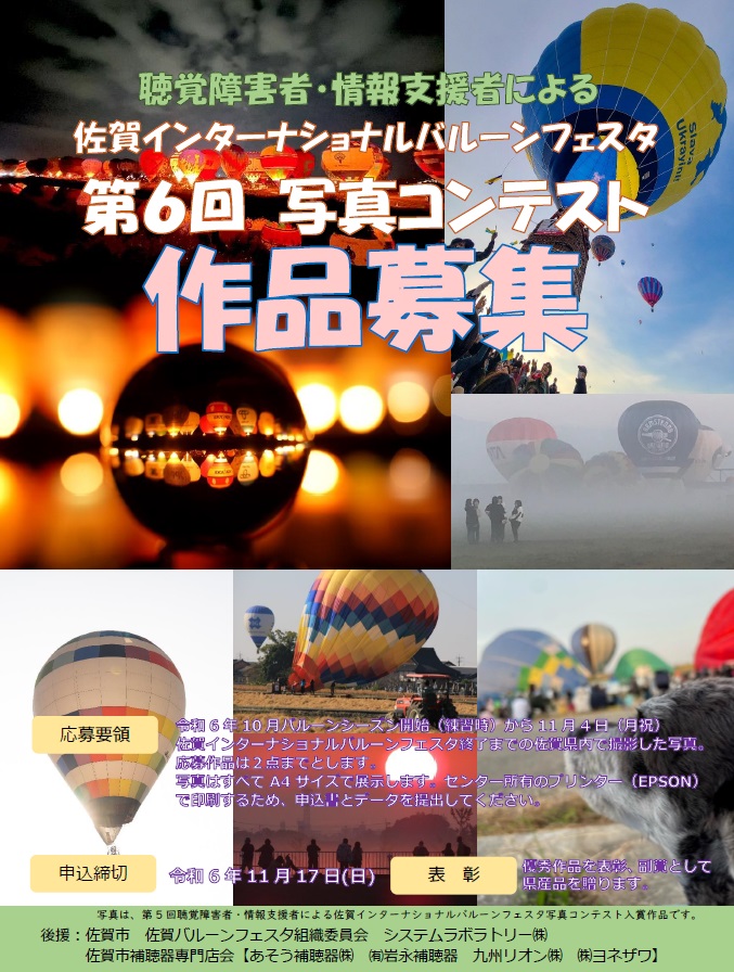 聴覚障害者・情報支援者によるバルーン写真コンテスト。今年も10月シーズン開始から、11月4日(月祝)バルーンフェスタ終了までに佐賀県内で撮影された作品を募集してします。詳細は募集要項・提出用紙をご覧ください。